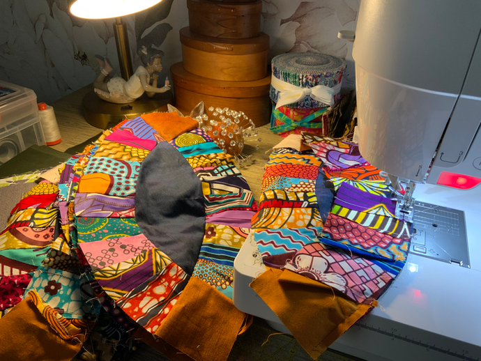 About six years ago, I started this Double Wedding Ring Quilt made of colorful African Wax fabric and Grunge blue cotton. Today, albeit six years later, I am sewing the other half of the African Wax fabric arc to the melon Grunge blue cotton centers. This is a great day to do some “no stress” sewing and continue to make this colorful masterpiece. Stay tuned on my progress! #nevergiveup #workinprogress
